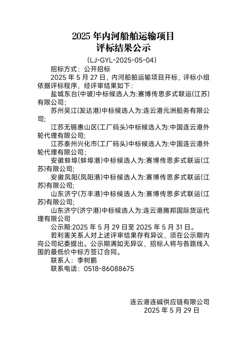 連云港連堿供應(yīng)鏈有限公司2025年內(nèi)河船舶運(yùn)輸項目評標(biāo)結(jié)果公示
