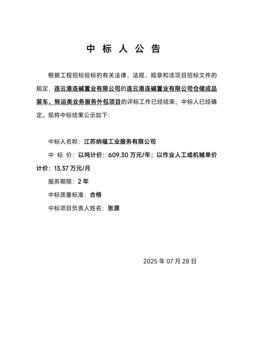 連云港連堿置業(yè)有限公司倉(cāng)儲(chǔ)成品裝車、轉(zhuǎn)運(yùn)類業(yè)務(wù)服務(wù)外包項(xiàng)目中標(biāo)人公告