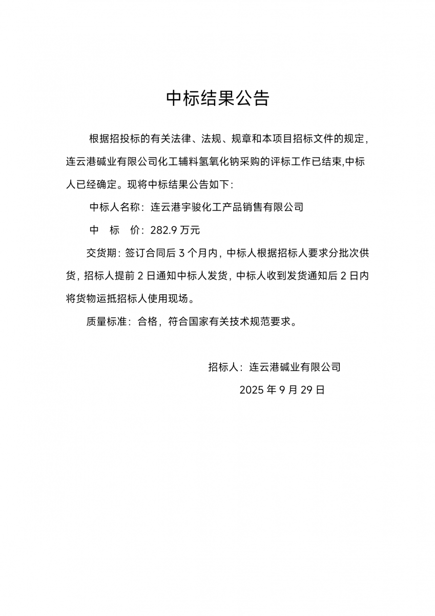 連云港堿業(yè)有限公司化工輔料氫氧化鈉采購中標結果公告
