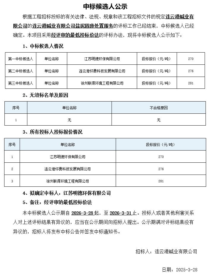 連云港堿業(yè)有限公司鹽泥固廢處置服務(wù)中標(biāo)候選人公示