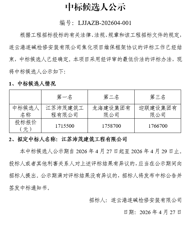 連云港連堿檢修安裝有限公司焦化項目維保框架協(xié)議中標候選人公示