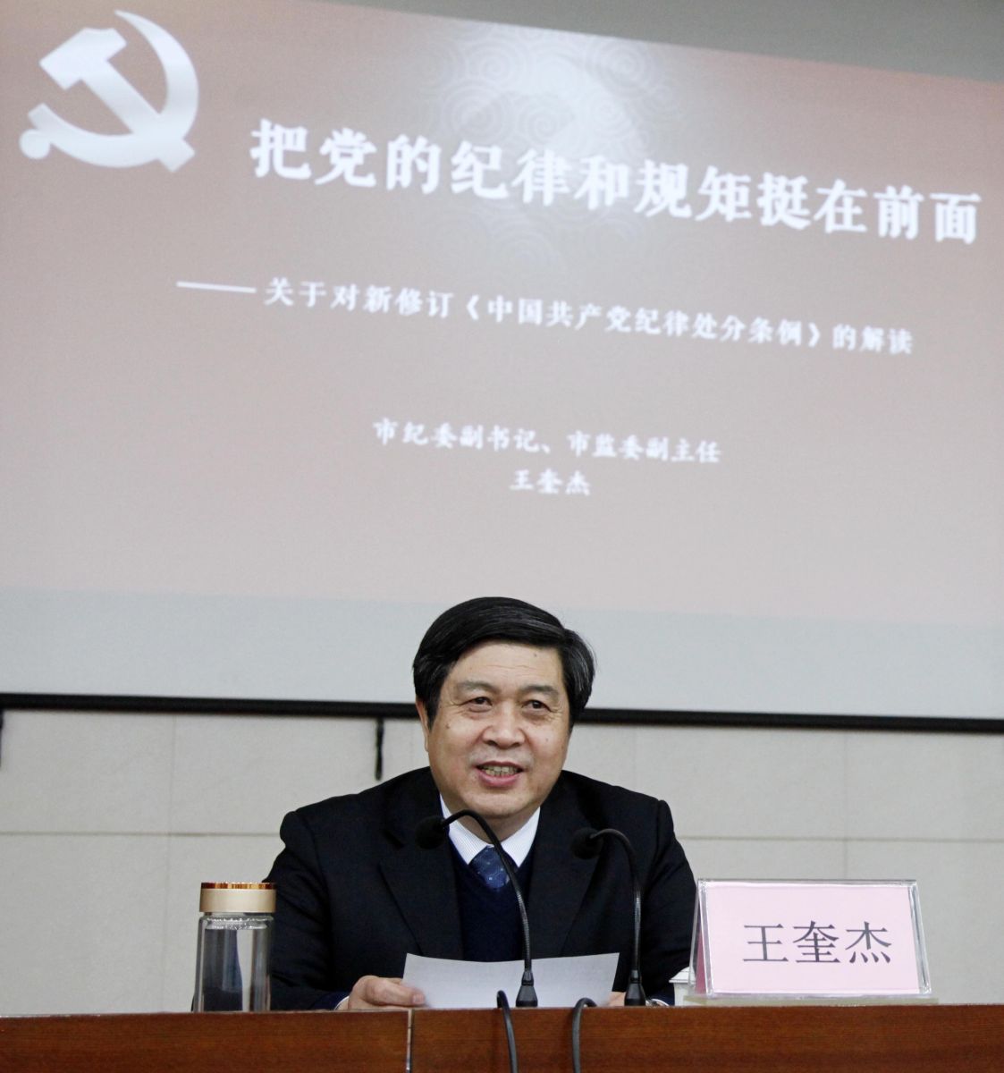 課上,王奎杰結(jié)合實際案例,以圖文并茂的形式,從修訂《條例》的重大意義、修改了哪些內(nèi)容、領(lǐng)導(dǎo)干部如何貫徹執(zhí)行好等三個方面,對《中國共產(chǎn)黨紀(jì)律處分條例》行了全面闡釋。并著重就如何把握《條例》的總則和違反政治紀(jì)律、組織紀(jì)律、廉潔紀(jì)律、群眾紀(jì)律、工作紀(jì)律、生活紀(jì)律的重點問題作了詳細講解。