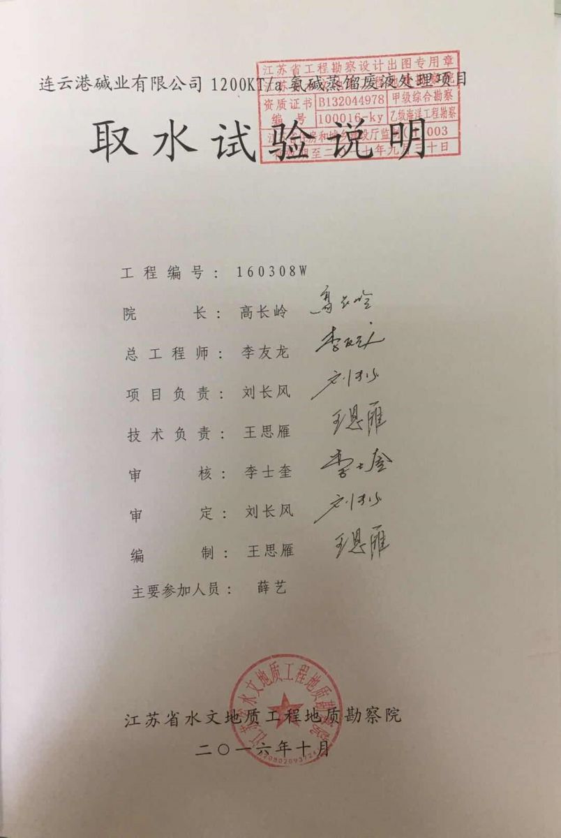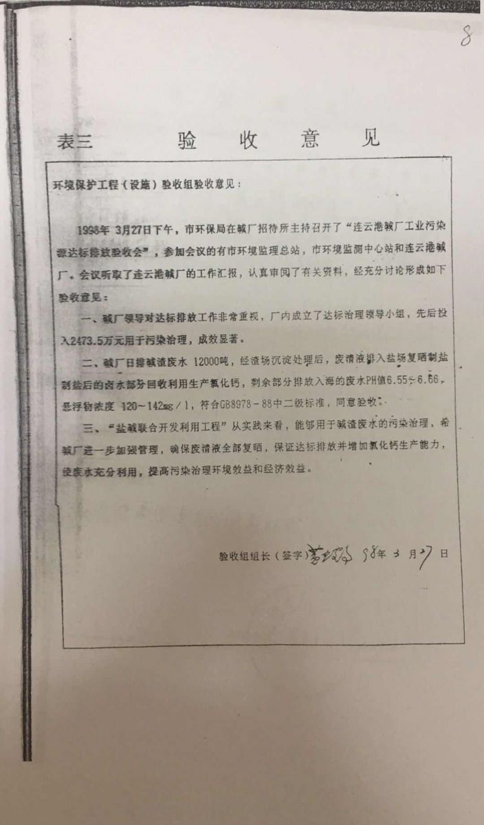 根據(jù)吉林化學工業(yè)公司設(shè)計院《連云港堿廠環(huán)境影響報告書》和原江蘇省環(huán)境保護局《關(guān)于對連云港堿廠環(huán)境影響報告書的批復(fù)》(蘇環(huán)管〔86〕31號)的要求,連云港堿廠產(chǎn)生的廢液送至渣場,經(jīng)澄清后,上清液經(jīng)自有排口閘直接排海。1997年,根據(jù)淮河流域水污染防治的要求,連云港市環(huán)保局向連云港堿廠下達了《關(guān)于淮河流域水污染源限期達標排放的決定》(連環(huán)管〔1997〕16號)。據(jù)此,連云港堿廠與臺北鹽場合作開發(fā)了“堿渣場上清液回收利用工程”項目,利用上清液制鹽、制鈣。1998年3月27日,該項目通過連云港市環(huán)保局組織的環(huán)保驗收,正式運行。
