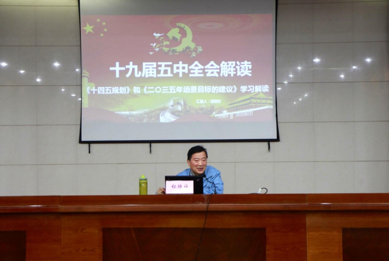 會(huì)上,鈕維社從“十九屆五中全會(huì)簡(jiǎn)介”、“全會(huì)召開(kāi)的背景和意義”、“回眸與展望”、“二0三五年遠(yuǎn)景目標(biāo)”、“十四五規(guī)劃”五個(gè)方面,結(jié)合具體事例,用通俗易懂的語(yǔ)言進(jìn)行了全面準(zhǔn)確的闡述,對(duì)我們認(rèn)真領(lǐng)會(huì)、準(zhǔn)確把握十九屆五中全會(huì)精神實(shí)質(zhì)具有十分重要的意義。