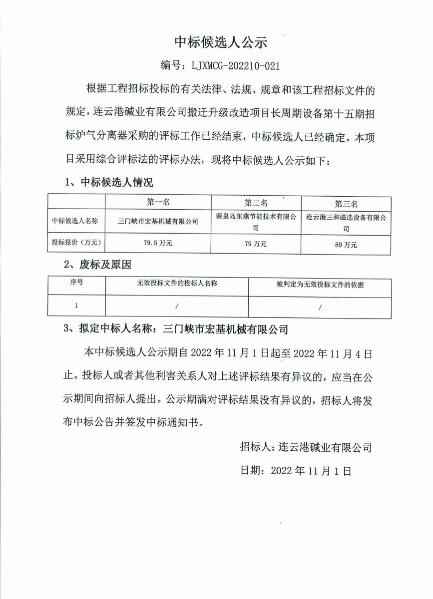 爐氣分離器采購招標(biāo)中標(biāo)候選人公示