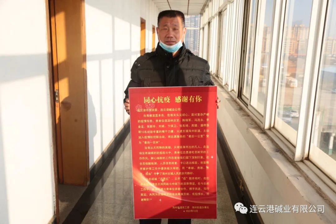 11月份疫情期間,根據(jù)市里統(tǒng)一安排,公司組織抗疫志愿者服務(wù)隊,全身心投入海州區(qū)疫情防控一線。公司職工林慶芝、陳瑞軍、馮茂永、李金龍、張新豐、劉斌、卞保衛(wèi)、張名琦、高健、潘德強等10名職工積極響應(yīng)公司黨委的號召,投入到社區(qū)志愿者服務(wù)行列,沖鋒在抗疫最前沿,為疫情防控作出了突出貢獻。近日,海州街道黨工委、海州街道辦事處送來了感謝信以及錦旗。