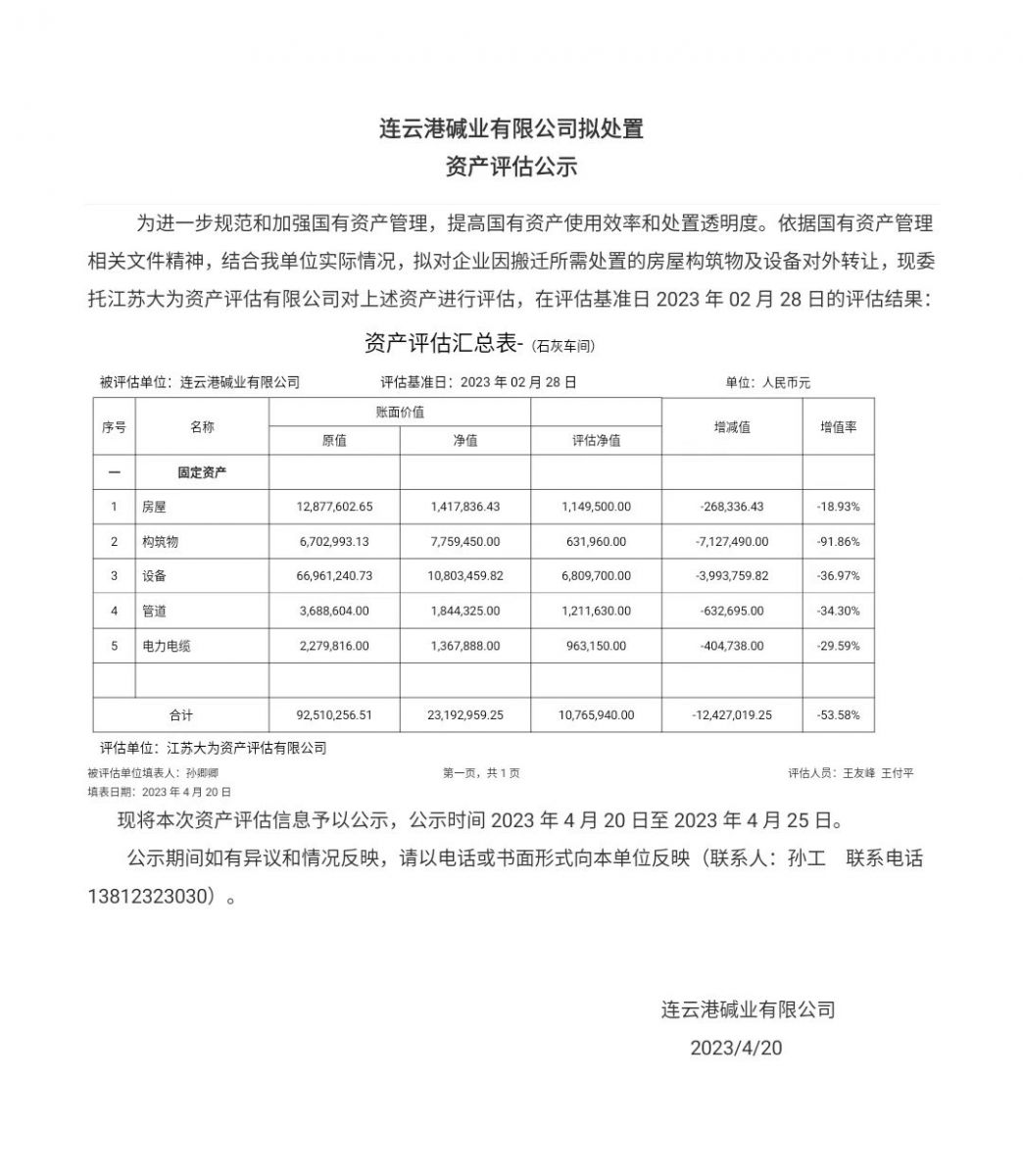 石灰車間資產(chǎn)評估公示