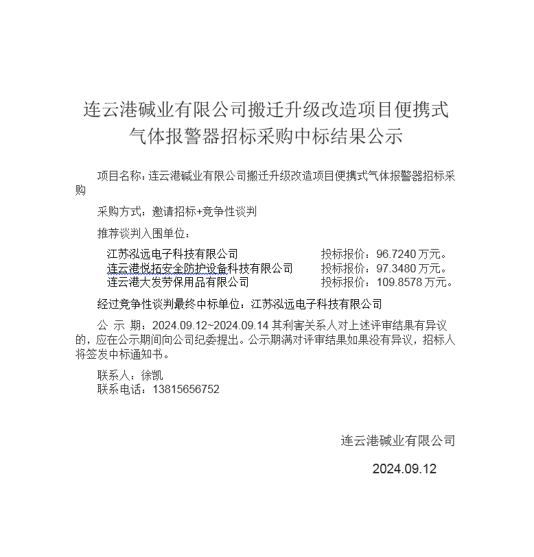 搬遷升級(jí)改造項(xiàng)目便攜式氣體報(bào)警器招標(biāo)采購(gòu)中標(biāo)結(jié)果公示